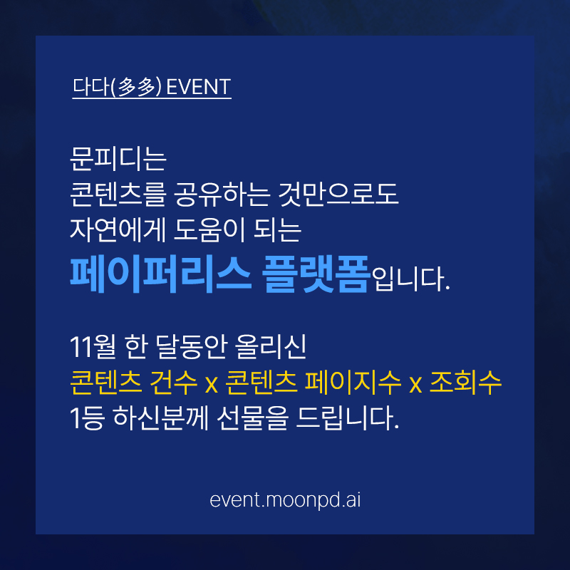 11월 한 달 동안 올리신 콘텐츠 건수 X 콘텐츠 페이지 수 X 조회수 1등 하신분께 선물을 드립니다.